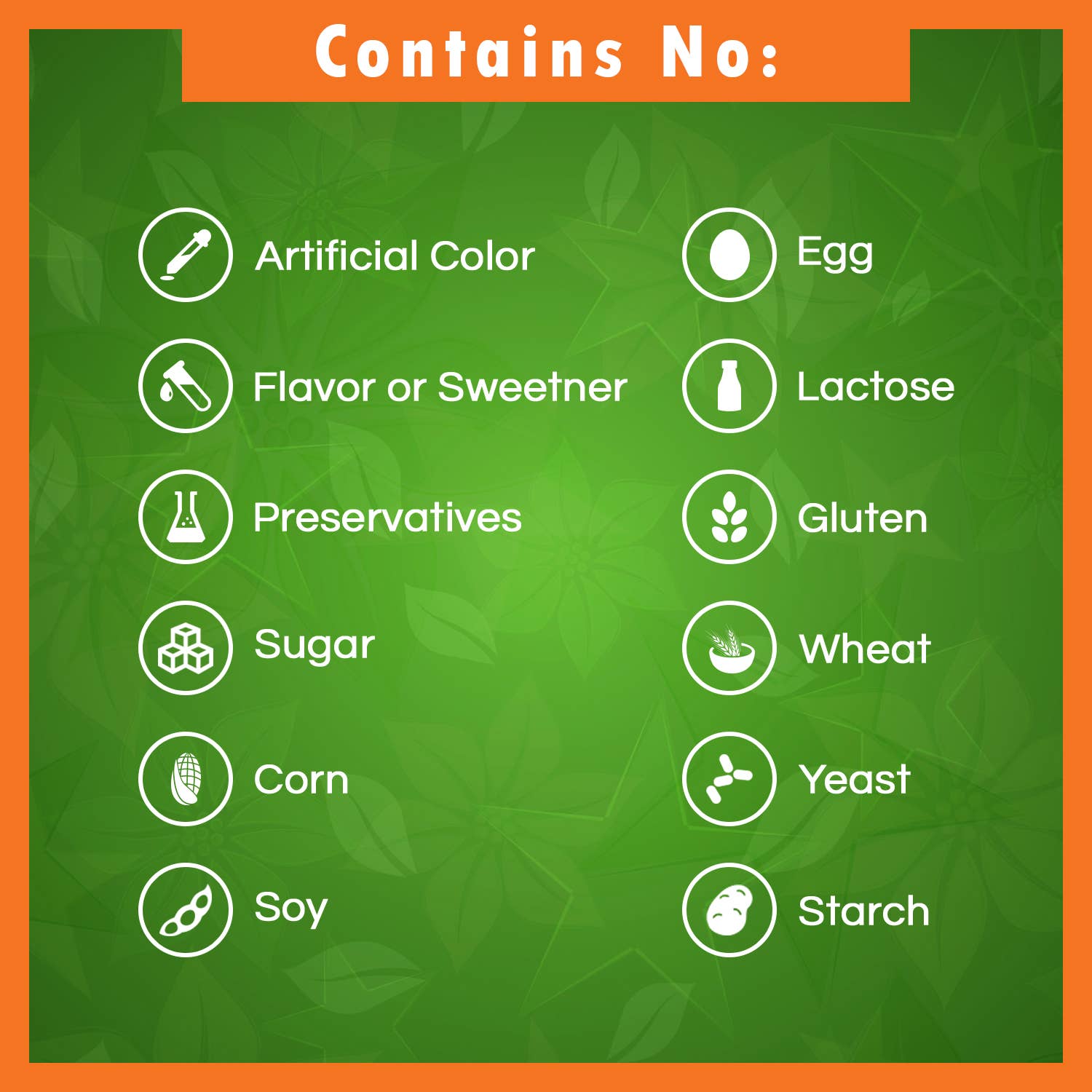 No Artificial Color, Flavor or Sweetener, No Preservatives, No Sugar, No Starch, No Corn, No Soy, No Egg, No Lactose, No Gluten, No Wheat, No Yeast, No Fish