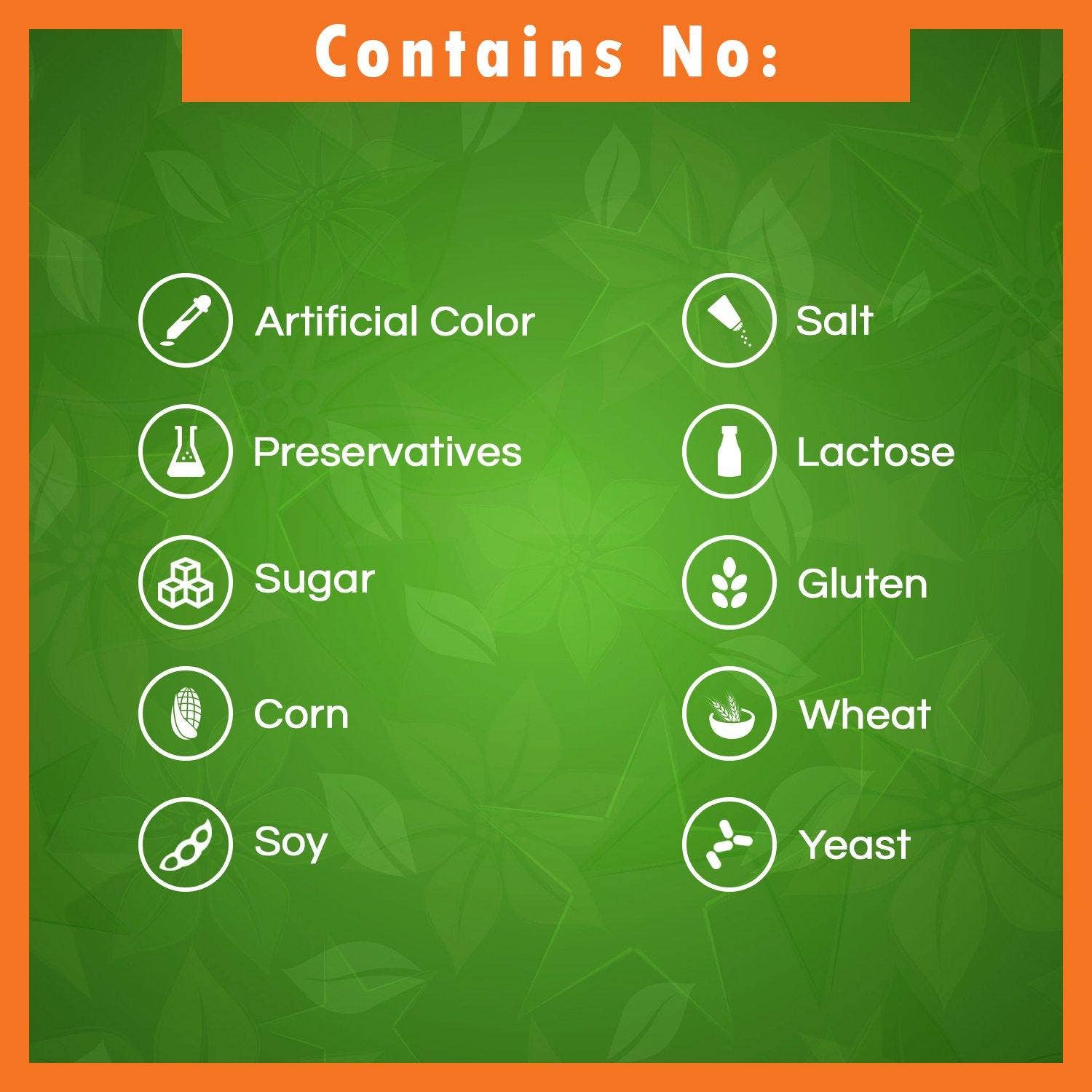 No artificial color, flavor, or sweetener, no preservatives, no sugar, no milk, no corn, no soy, no egg, no lactose, no gluten, no wheat, no yeast, no fish. Sodium free.