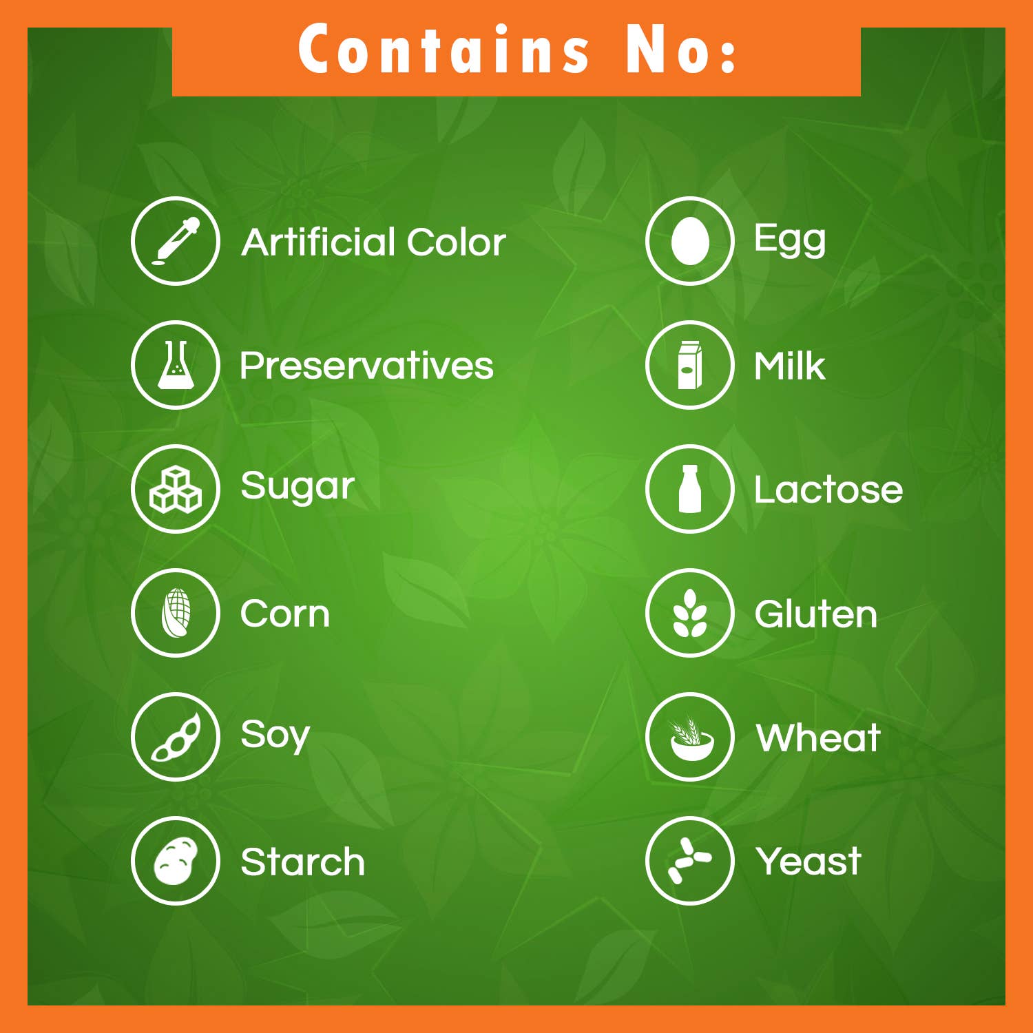 No Artificial Color, Flavor, or Sweetener, No Preservatives, No Sugar, No Milk, No Corn, No Soy, No Egg, No Lactose, No Gluten, No Wheat, No Yeast, No Fish. Sodium Free.