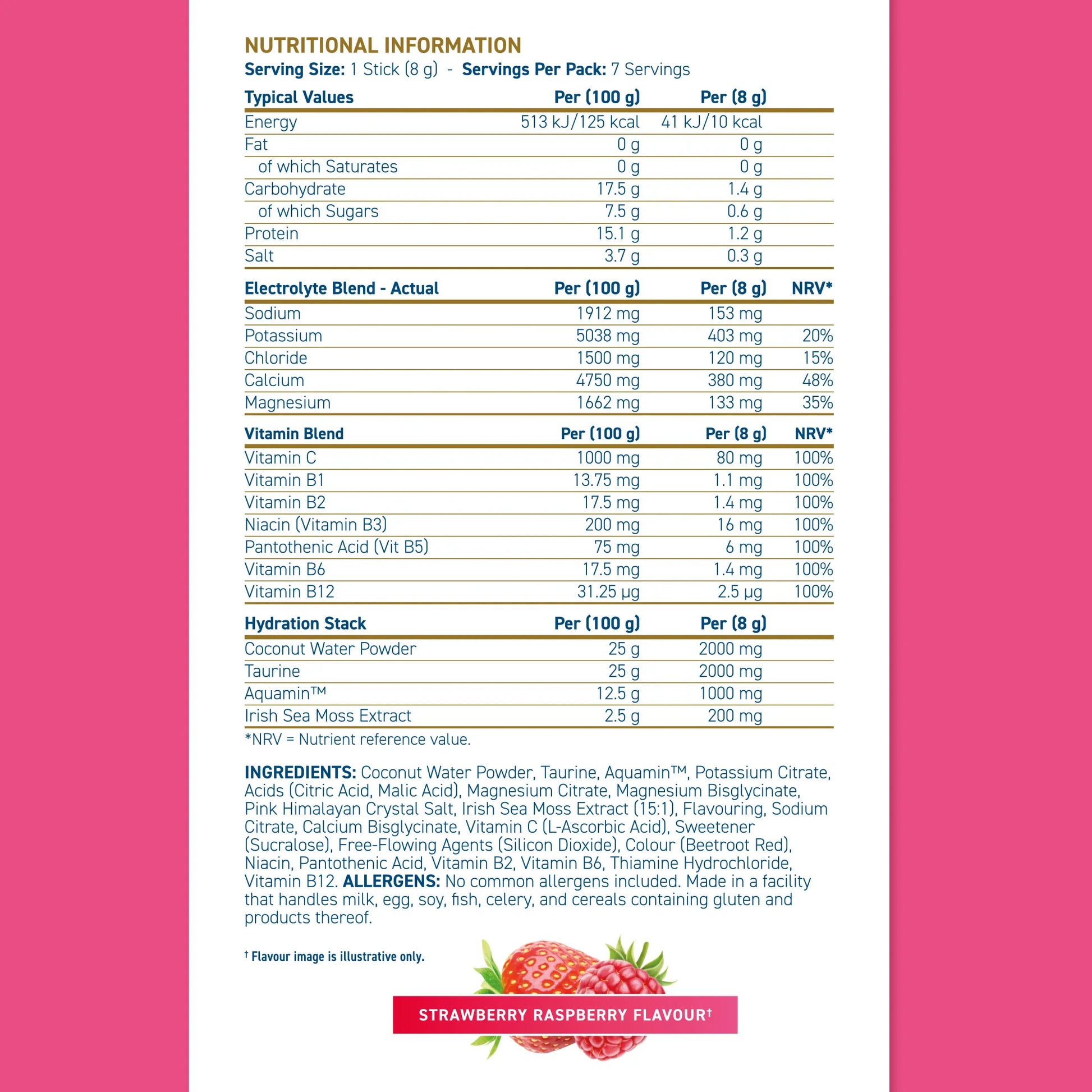 Strawberry & Raspberry: Coconut Water Powder, Taurine, Aquamin™, Potassium Citrate, Acids (Citric Acid, Malic Acid), Magnesium Citrate, Magnesium Bisglycinate, Pink Himalayan Crystal Salt, Irish Sea Moss Extract (15:1), Flavouring, Sodium Citrate, Calcium Bisglycinate, Vitamin C (L-Ascorbic Acid), Sweetener (Sucralose), Free-Flowing Agents (Silicon Dioxide), Colour (Beetroot Red), Niacin, Pantothenic Acid, Vitamin B2, Vitamin B6, Vitamin B1, Vitamin B12.